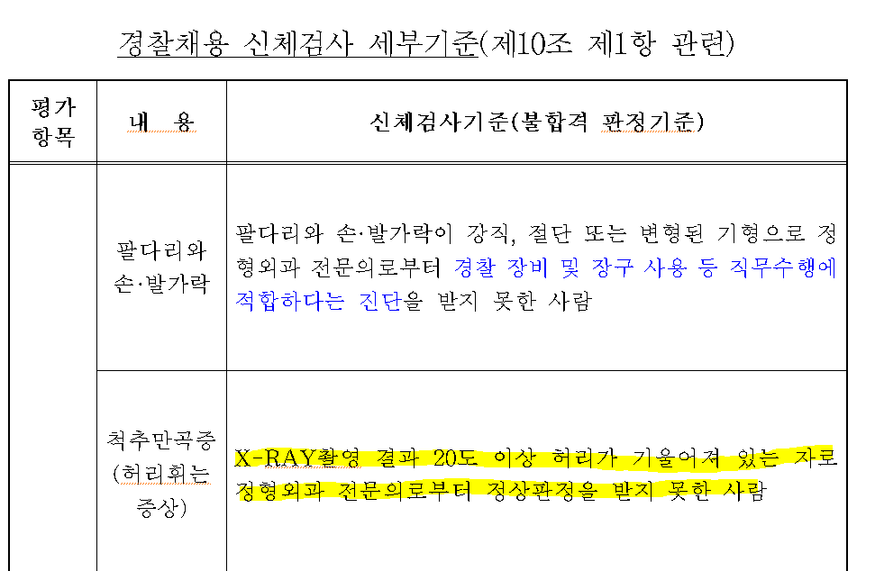 아뿔싸! [경찰채용 신체검사 세부기준]에 척추측만증에 대한 기준이 있는 거야.