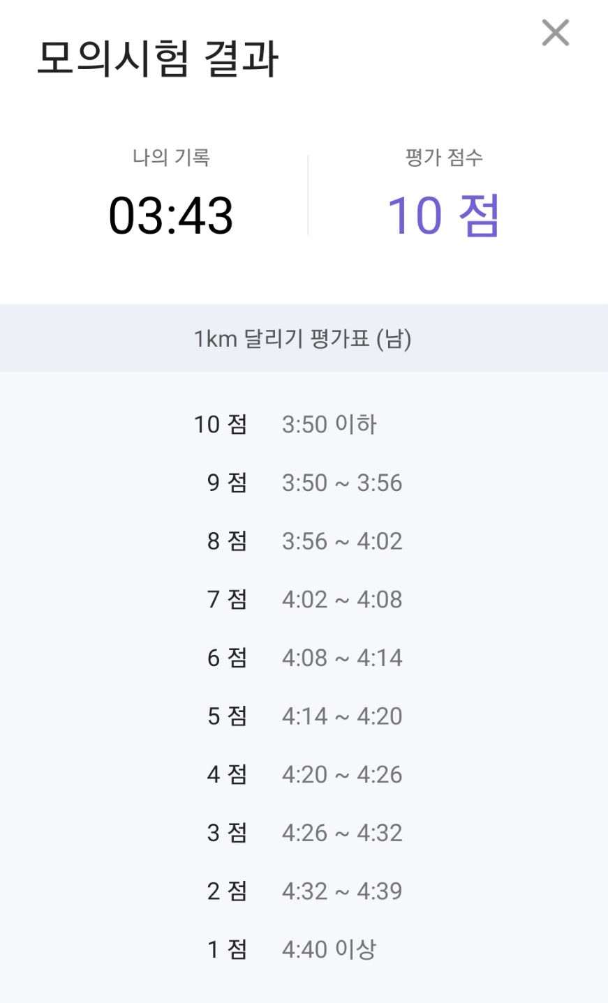 하지만 1000m 만점 커트라인이 3분 50초인데 이게 꽤나 고통스럽다.
