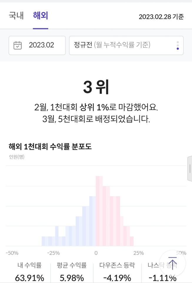 사실 2월 25일까지만 해도 내가 1위 자리를 계속 지켰는데 막판에 누군가 크게 수익을 올리며 3위로 밀려났다.