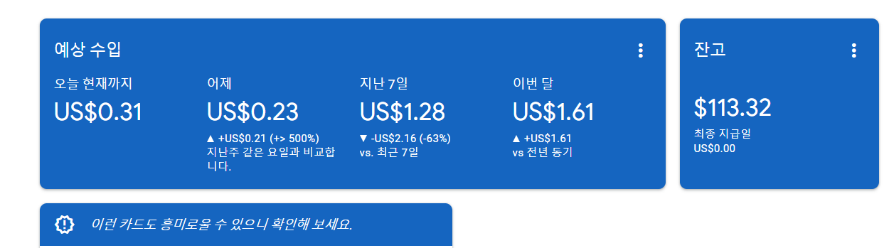 결론적으로 1년 4개월동안 블로그를 운영하면서, 113달러의 수익이 생겼다.